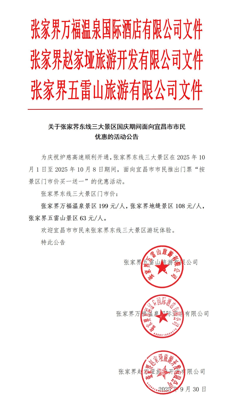 關(guān)于張家界東線三大景區(qū)國慶期間面向宜昌市市民優(yōu)惠的活動(dòng)公告